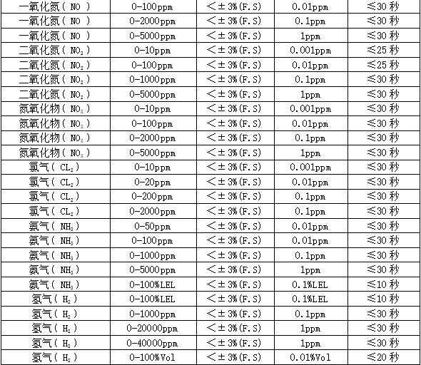 檢測范圍:0~1、10、100、1000、5000、50000、100000ppm、200毫克/升、100%LEL、20%、50%、99.999%、100%Vol可選,其他量程可訂制。